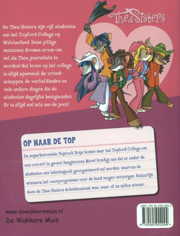 De superberoemde Toprock Boys komen naar het Topford College om een concert te geven! Zanglerares Merel kondigt aan dat er onder de studenten een talentenjacht georganiseerd zal worden, waarvan de winnaars het voorprogramma voor de band mogen verzorgen. Natuurlijk doen de Thea Sisters dolenthousiast mee, maar of ze zullen winnen…lees het in Op naar de top
