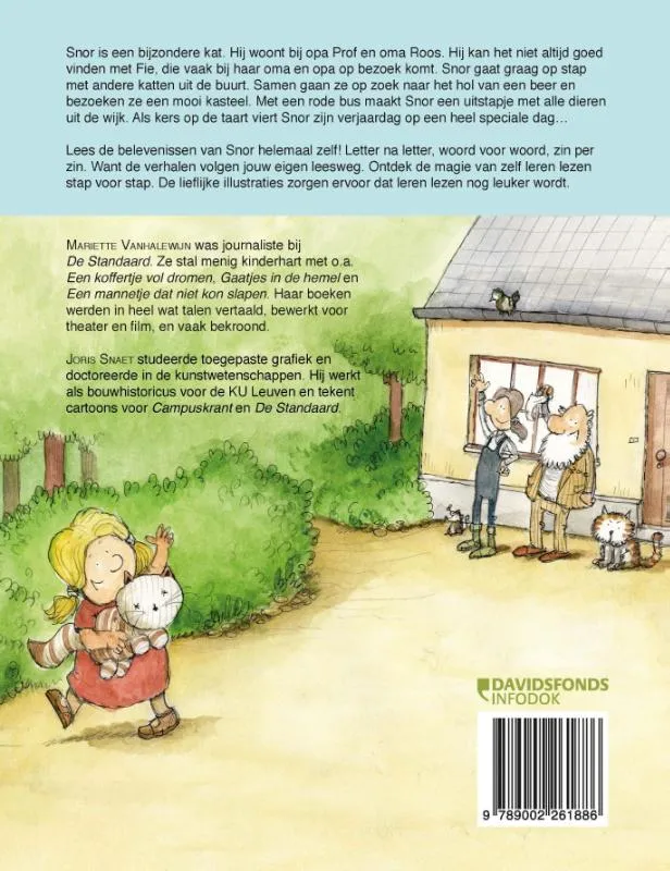 Snor is een bijzondere kat. Hij woont bij opa Prof en oma Roos. Hij kan het niet altijd goed vinden met Fie, die vaak bij haar oma en opa op bezoek komt. Snor gaat graag op stap met andere katten uit de buurt. Samen gaan ze op zoek naar het hol van een beer en bezoeken ze een mooi kasteel. Met een rode bus maakt Snor een uitstapje met alle dieren uit de wijk. Als kers op de taart viert Snor zijn verjaardag op een heel speciale dag… Lees de belevenissen van Snor helemaal zelf! Letter na letter, woord voor woord, zin per zin. Want de verhalen volgen jouw eigen leesweg. Ontdek de magie van zelf leren lezen stap voor stap. De lieflijke illustraties zorgen ervoor dat leren lezen nog leuker wordt. Mariette Vanhalewijn was journaliste bij De Standaard. Ze stal menig kinderhart met o.a. Een koffertje vol dromen, Gaatjes in de hemel en Een mannetje dat niet kon slapen. Haar boeken werden in heel wat talen vertaald, bewerkt voor theater en film, en vaak bekroond. Joris Snaet studeerde toegepaste grafiek en doctoreerde in de kunstwetenschappen. Hij werkt als bouwhistoricus voor de KU Leuven en tekent cartoons voor Campuskrant en De Standaard.