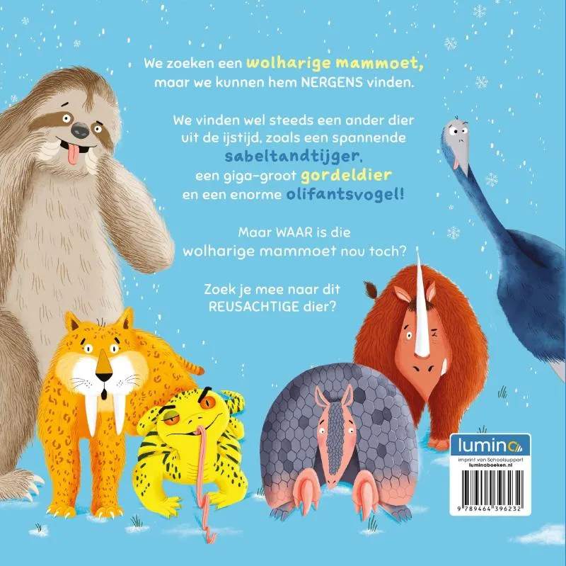 We zoeken een wolharige mammoet, maar we kunnen hem NERGENS vinden.We vinden wel steeds een ander dier uit de ijstijd, zoals een sabeltandtijger, een giga-groot gordeldier en een enorme olifantsvogel!Maar WAAR is die wolharige mammoet nou toch?Zoek je mee naar dit REUSACHTIGE dier?