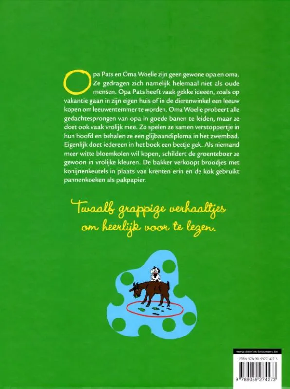 Opa Pats en oma Woelie zijn geen gewone opa en oma. Ze gedragen zich namelijk helemaal niet als oude mensen. Opa Pats heeft vaak gekke ideeën, zoals op vakantie gaan in zijn eigen huis of in de dierenwinkel een leeuw kopen om leeuwentemmer te worden. Oma Woelie probeert alle gedachtesprongen van opa in goede banen te leiden, maar ze doet ook vaak vrolijk mee. Zo spelen ze samen verstoppertje in hun hoofd en behalen ze een glijbaandiploma in het zwembad. Eigenlijk doet iedereen in het boek een beetje gek. Als niemand meer witte bloemkolen wil kopen, schildert de groenteboer ze gewoon in vrolijke kleuren. De bakker verkoopt broodjes met konijnenkeutels in plaats van krenten erin en de kok gebruikt pannenkoeken als inpakpapier.