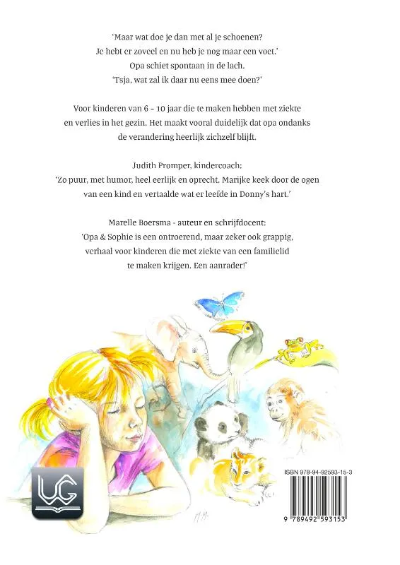 Vanaf het moment dat Sophie hoort dat opa een operatie moet ondergaan volgt het boek opa en Sophie. Wanneer ze op bij haar opa in het ziekenhuis op bezoek gaat, ontdekt Sophie een wonderlijke wereld. Opa die een ‘hut’ onder zijn dekens heeft, een kastje waarmee je het bed op en neer kunt laten bewegen. Maar wat moet opa nou met al zijn schoenen nu hij een been mist? En wat als opa thuiskomt? Hoe gaat het dan en waarmee kan Sophie helpen? Na het lezen van ons boekje Opa en Sophie krijg je antwoord op bovenstaande vragen en zie je hoe de familie van Sophie omgaat met de grote verandering in het leven van opa.
