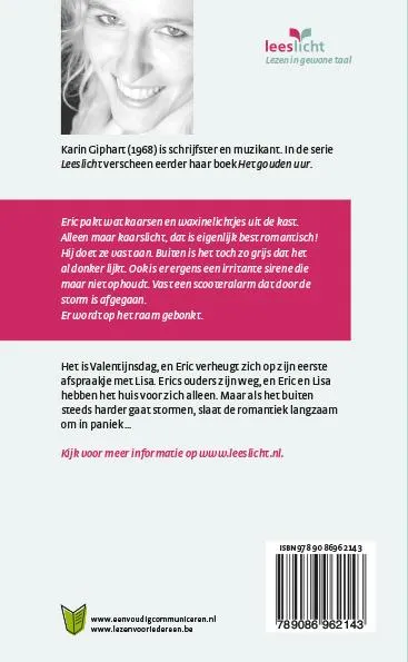 Makkelijk lezen-uitgave. Oorspronkelijk verhaal. KArin Giphart schreef deze roman speciaal voor www.leeslicht.nl. Een roman die zowel voor jongeren als voor volwassenen geschikt is op 1F (A2). Het stormt al een paar dagen, en de regen wordt steeds heviger. Lisa gaat toch naar buiten. Op Valentijnsdag hebben Lisa en Eric hun eerste date. Bij Eric thuis, zijn ouders zijn het weekend weg. Als ze eenmaal bij Eric is, blijkt hoe erg het weer tekeer gaat. Het water stroomt de gang en de woonkamer in. Ze vluchten naar de eerste verdieping. Dan valt ook de elektriciteit uit. Boven Eric woont gelukkig nog de oude buurman, en hij is op alles voorbereid. Hij heeft namelijk de Watersnoodramp van 1953 overleefd!
