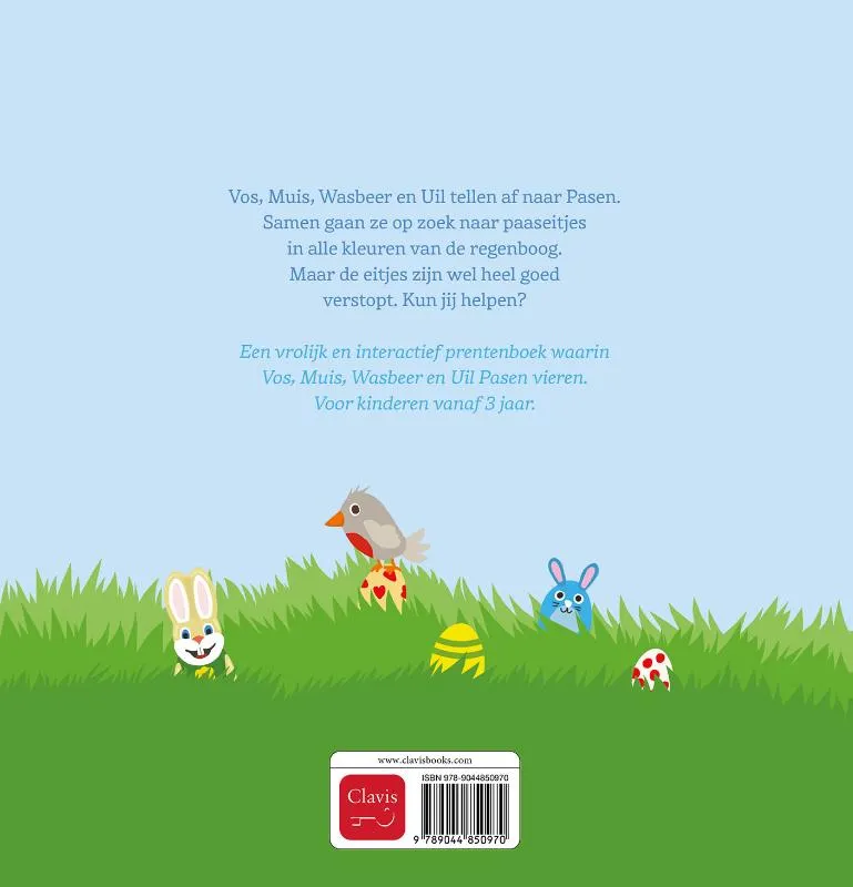 Een vrolijk en interactief prentenboek waarin Vos, Muis, Wasbeer en Uil Pasen vieren. Voor kinderen vanaf 3 jaar.