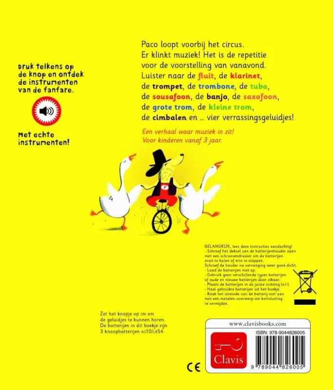 Paco loopt voorbij het circus. Er klinkt muziek! Het is de repetitie voor de voorstelling van vanavond. Luister naar de fluit, de klarinet, de trompet, de trombone, de tuba, de sousafoon, de banjo, de saxofoon, de grote trom, de kleine trom, de cimbalen en … vier verrassingsgeluidjes!