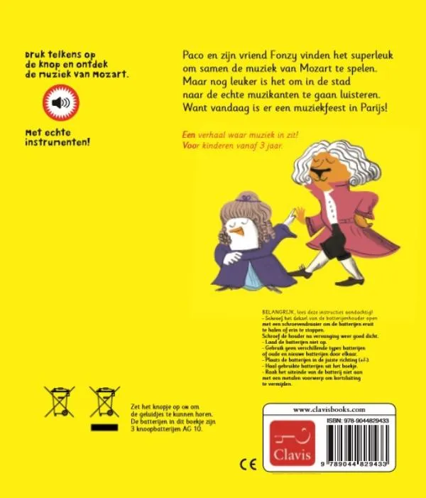 Paco de hond en zijn vriend Fonzy vinden het leuk om muziek van Mozart te spelen. Nog leuker is om naar echte muzikanten te gaan luisteren in Parijs. Via druktoetsen hoor je diverse muziekfragmentjes. Met enige weetjes over Mozart en paginagrote kleurenillustraties. Vanaf ca. 3 t/m 5 jaar.