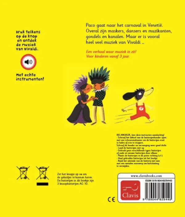 Paco de hond gaat naar het carnaval in Venetië. Overal ziet hij maskers, dansers en muzikanten. Via druktoetsen hoor je muziekfragmentjes van Vivaldi. Met enige weetjes over Vivaldi en paginagrote kleurenillustraties. Vanaf ca. 3 t/m 5 jaar.