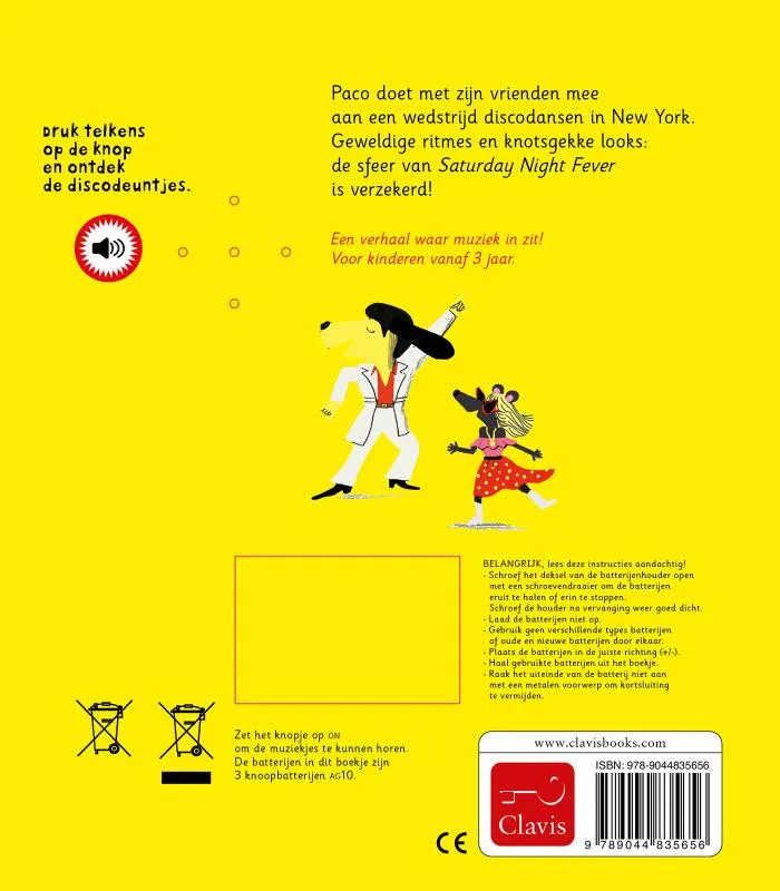 Het hondje Paco en zijn dierenvrienden doen mee aan een wedstrijd discodansen in New York. Via druktoetsen hoor je discomuziek en andere gelluiden. Met paginagrote kleurenillustraties. Vanaf ca. 3 t/m 5 jaar.