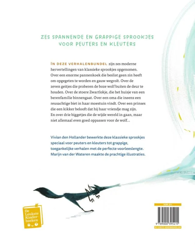 Vivian den Hollander bewerkte zes bestaande sprookjes naar een moderne versie speciaal voor peuters. Het verhaal van de pannenkoek die heel hard wegrent voordat hij opgegeten kan worden – maar uiteindelijk onverbiddelijk in de bek van de vos belandt. Van de zeven geitjes die per ongeluk de deur opendoen voor een hongerige wolf. Van de prinses die geholpen wordt door een galante kikker en hem belooft dat hij haar vriendje mag zijn. Van de stoere Zwartlokje, die in het huisje van drie beren terechtkomt en daar heerlijk in een bedje gaat slapen. Over een oma die ineens een reuzenbiet in haar moestuin vindt. En over de drie biggetjes, die elk een huisje bouwen. Maar zijn hun huisjes stevig genoeg om hen te beschermen tegen de grote boze wolf?