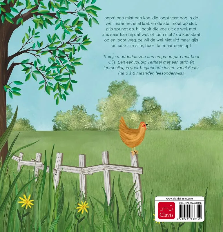 Trek je modderlaarzen aan en ga op pad met boer Gijs. Een eenvoudig verhaal met een strip én leerspelletjes voor beginnende lezers vanaf 6 jaar (na 6 à 8 maanden leesonderwijs).