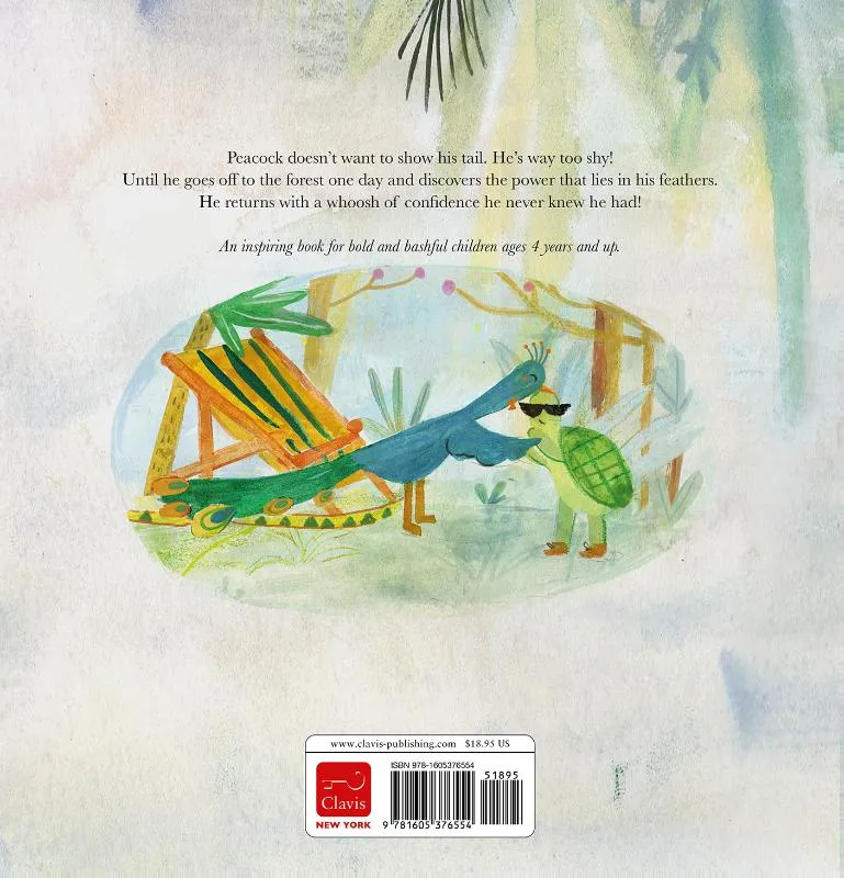 Peacock (ik-persoon) heeft nog nooit zijn staart uitgevouwen. Die van hem is vast niet zo mooi als van zijn familieleden. Bij andere dierenvrienden, zoals Tortoise, de mieren en grandpa Bird, durft hij wel zijn staart te gebruiken om hen te helpen. Dan doet Pauw een bijzondere ontdekking. Prentenboek met kleurrijke illustraties. Vanaf ca. 4 jaar.