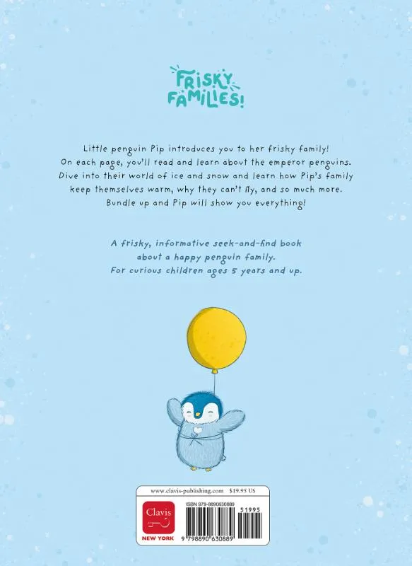 Little penguin Pip introduces you to his frisky family! On each page, you’ll discover more about the emperor penguins. Dive into their world of ice and snow and learn how Pip’s family keep themselves warm, why they can’t fly, and so much more. Bundle up and Pip will show you everything! A frisky, informative seek-and-find book about a happy penguin family. For curious children ages 5 years and up.