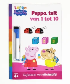 Verken de vrolijke wereld van Peppa Pig met dit vrolijke telboek. In ‘Peppa telt van 1 tot 10′ nemen Peppa en haar vrienden je mee op een avontuurlijke reis terwijl ze je helpen tellen van 1 tot 10. Ook oefen je met één erbij optellen en één eraf halen, terugtellen en nog veel meer oefenopdrachten. Als je alles af hebt, wis je je antwoorden uit met de pen en begin je lekker opnieuw! Ga met Peppa mee op avontuur in dit boek vol telspelletjes en ontwikkel je rekenvaardigheden.<br><br>Leren met Peppa Pig is een educatief uitgeefprogramma dat zich richt op jonge kinderen (vanaf 3 jaar). Er verschijnen uitgaven op het gebied van rekenen, schrijven, sociale vaardigheden, emoties en creativiteit. <br>Peppa Pig is het schattige en ondeugende biggetje uit de gelijknamige wereldberoemde en razend populaire animatieserie. Ze woont samen met haar kleine broertje George, Mama Big en Papa Big en houdt van spelletjes spelen, verkleden, dagjes uit en in modderpoelen springen! Peppa’s avonturen eindigen altijd goed en met een vrolijke knor.