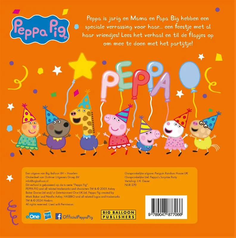 Het is feest, want ‘Peppa Pig’ is jarig in ‘Peppa’s verrassingsfeestje’! Dit interactieve prentenboek met flapjes barst van de vrolijkheid en maakt voorlezen nóg leuker. Mama en Papa Big hebben een speciale verrassing voor Peppa in petto: een feestje met ál haar vriendjes. Peppa staat in het middelpunt van belangstelling en jij kunt samen met haar alle verjaardagsverrassingen ontdekken. <br><br>’Peppa Pig’ is het schattige en ondeugende biggetje uit de gelijknamige wereldberoemde en razend populaire animatieserie. Ze woont samen met haar kleine broertje George, Mama Big en Papa Big en houdt van spelletjes spelen, verkleden, dagjes uit en in modderpoelen springen! Peppa’s avonturen eindigen altijd goed en met een vrolijke knor.