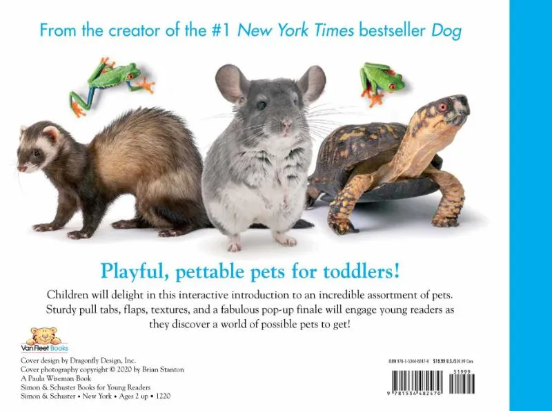Sturdy pull tables, flaps, textures, and a fabulous pop-up finale will engage young readers as they discover the world of possible pets to get! Pets is an interactive and read aloud favorite for all toddlers who love animals.