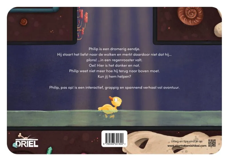Philip is een dromerig eendje. Hij staart het liefst naar de wolken en merkt daardoor niet dat hij… plons! …in een diepe put valt. Oei! Hier is het donker en nat. Philip weet niet meer hoe hij terug naar boven moet. Kun jij hem helpen?