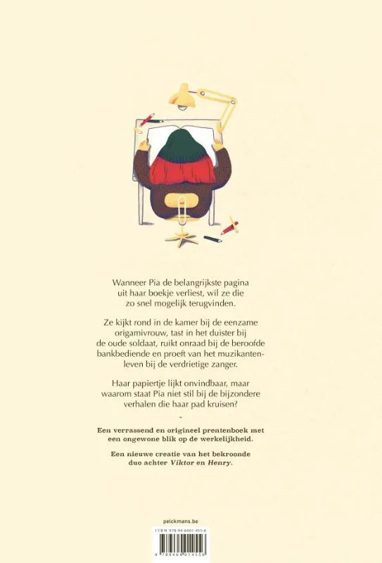 Wanneer Pia een belangrijke pagina uit haar boekje verliest, wil ze die zo snel mogelijk terugvinden. Ze kijkt rond in de kamer bij de eenzame origamivrouw, tast in het duister bij de oude soldaat, ruikt onraad bij de beroofde bankbediende en proeft van het muzikantenleven bij de verdrietige zanger. Haar papiertje lijkt onvindbaar, maar waarom staat Pia niet stil bij de bijzondere verhalen die haar pad kruisen?