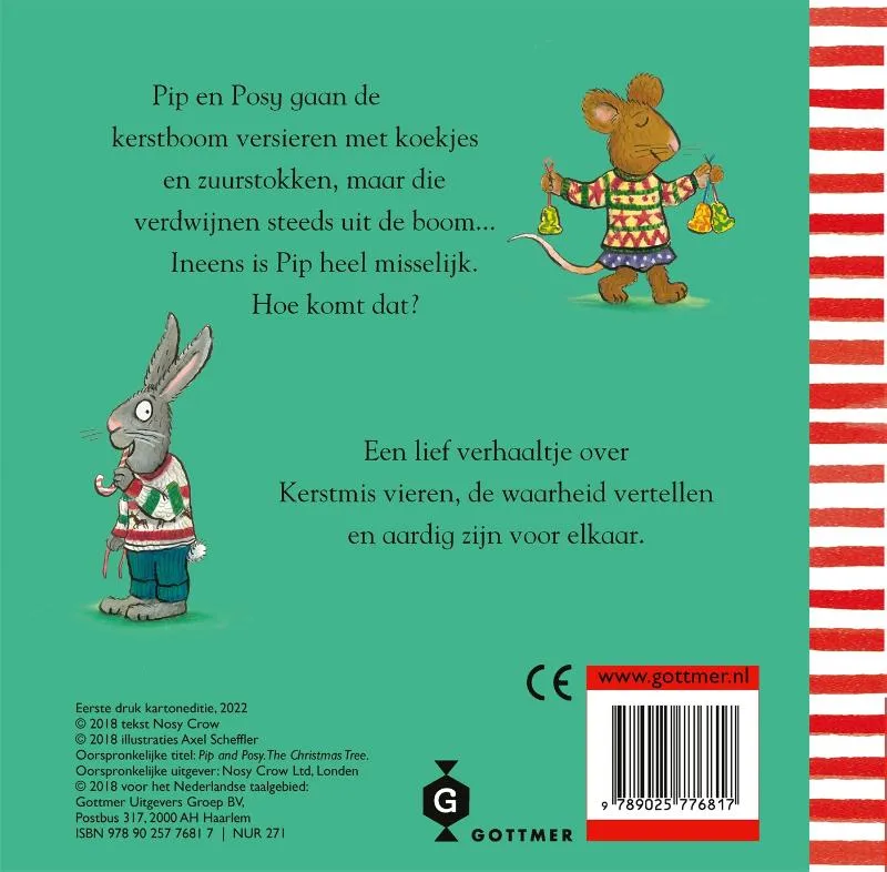Pip en Posy gaan de kerstboom versieren. Ze hangen er kerstkoekjes in, zuurstokken en chocoladekoekjes. Maar steeds verdwijnt er iets uit de boom… Hoe kan dat? En waarom is Pip zo misselijk? ‘Pip en Posy en de kerstboom’ is een lief verhaaltje voor peuters over Kerstmis vieren, de waarheid vertellen en aardig zijn voor elkaar.