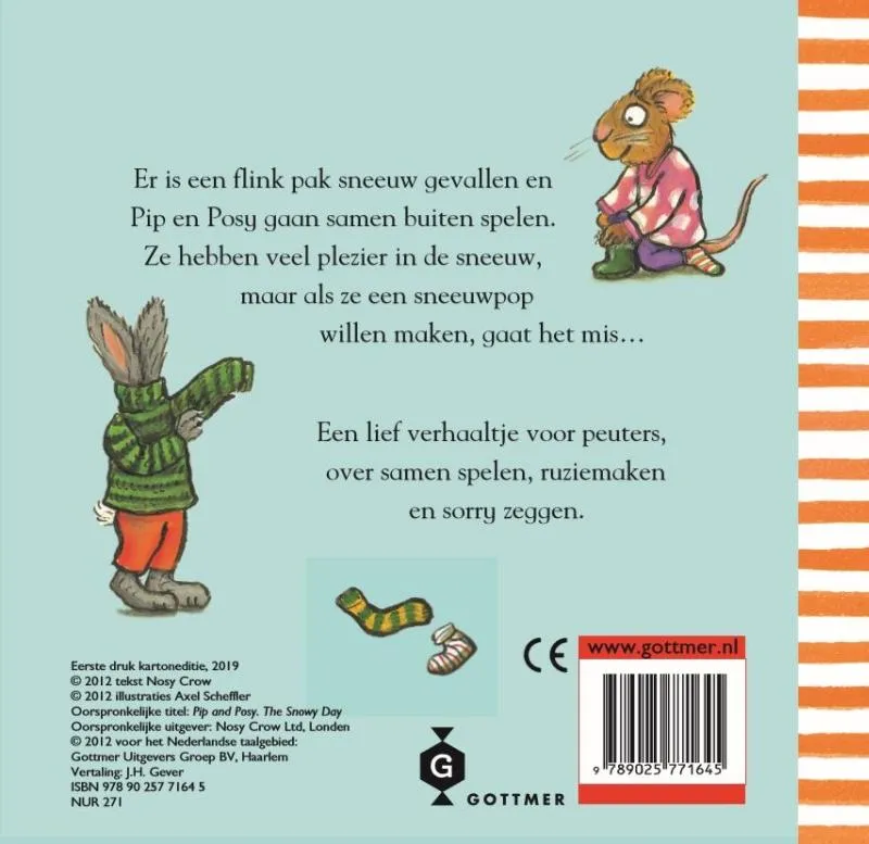 Pip en Posy zijn de beste vriendjes in deze serie over de grote en kleine ups en downs in een peuterleven. Meestal tenminste, want soms maken ze weleens ruzie. Axel Scheffler, de maker, is inmiddels wereldberoemd. Zijn werk is in meer dan 30 talen verschenen. Er is een flink pak verse sneeuw gevallen en Pip en Posy staan te trappelen om naar buiten te gaan. Eerst kleden ze zich lekker dik aan en eenmaal buiten hebben ze samen veel plezier. Ze vangen sneeuwvlokjes op hun tong, spelen met de slee en beginnen aan een sneeuwpop. Maar dan gaat het mis. Er ontstaat een flinke ruzie en al snel zijn de vriendjes koud, nat en heel verdrietig. Gelukkig lukt het Pip en Posy om met een slimme oplossing een vrolijk einde te maken aan hun ruzie in de sneeuw. En daar hoort natuurlijk ook `sorry zeggen bij, en een dikke knuffel!