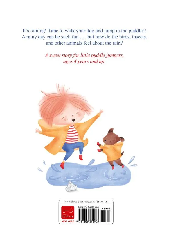 Een meisje en haar hondje gaan naar buiten als het regent. Ze redden een wormpje en andere kriebelbeestjes en genieten van het geluid van de wind. Als de regen stopt, zien ze prachtige bloemen. Wat is het toch fijn buiten in de regen! Prentenboek met vrolijk gekleurde illustraties en tekst op rijm. Vanaf ca. 4 jaar.