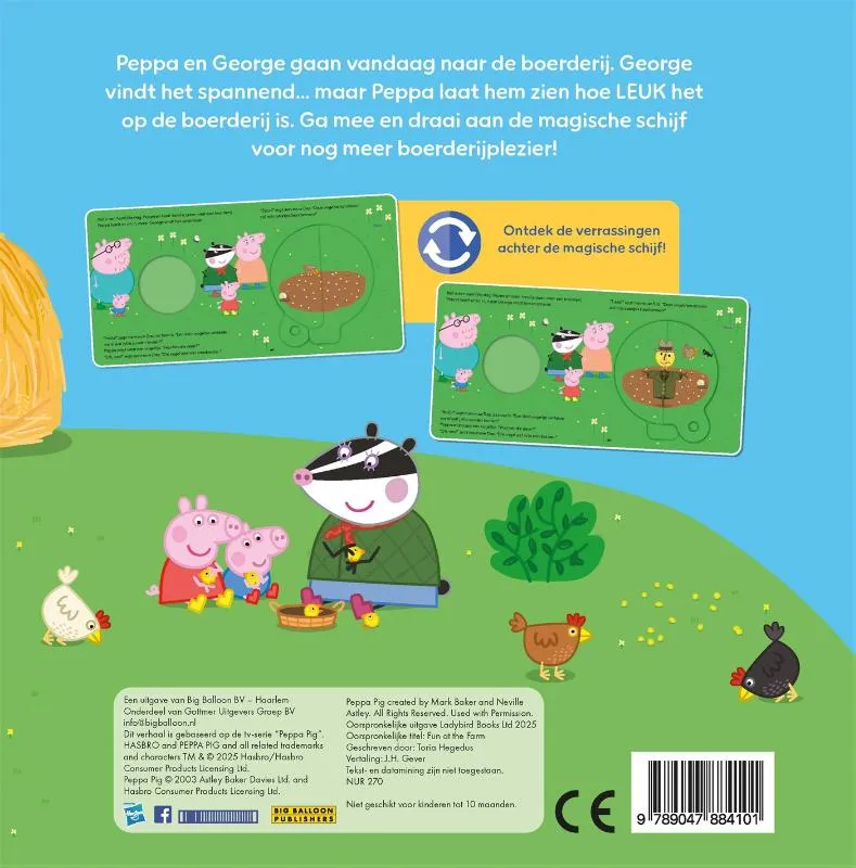‘Plezier op de boerderij’ is een Peppa Pig kartonboek met een magische draaischijf! Peppa en haar familie gaan naar de boerderij, maar George vindt het spannend. Peppa laat zien hoe leuk het boerenleven is. Ga mee op avontuur en draai aan de magische schijf voor verstopte verrassingen en nóg meer boerderijplezier. Leuk om voor te lezen voor kindjes vanaf 3 jaar.<br><br><br>Peppa Pig is het schattige en ondeugende biggetje uit de gelijknamige wereldberoemde en razend populaire animatieserie. Ze woont samen met haar kleine broertje George, Mama Big en Papa Big en houdt van spelletjes spelen, verkleden, dagjes uit en in modderpoelen springen! Peppa’s avonturen eindigen altijd goed en met een vrolijke knor. <br><br>Lees ook de andere vrolijke kinderboeken: Peppa Pig ‘Toet. Toet! Vrrroem!’, ‘Plezier op de boerderij’ en ‘Peppa’s eerste zwemles’.