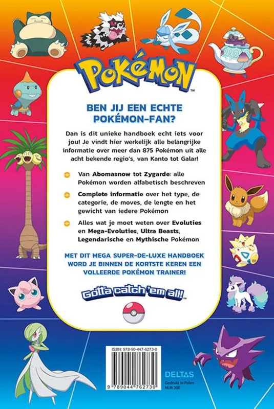 Ben jij een echte Pokémon-fan? Dan is dit unieke handboek echt iets voor jou! Je vindt hier werkelijk alle belangrijke informatie over meer dan 875 Pokémon uit alle acht bekende regio’s, van Kanto tot Galar! – Van Abomasnow tot Zygarde: alle Pokémon worden alfabetisch beschreven. – Complete informatie over het type, de categorie, de moves, de lengte en het gewicht van iedere Pokémon – Alles wat je moet weten over Evoluties en Mega-Evoluties, Ultra Beasts, Legendarische en Mythische Pokémon Met dit mega super-de-luxe handboek word je binnen de kortste keren een volleerde Pokémon trainer! Prachtige hardback uitgave met 2 leeslintjes.