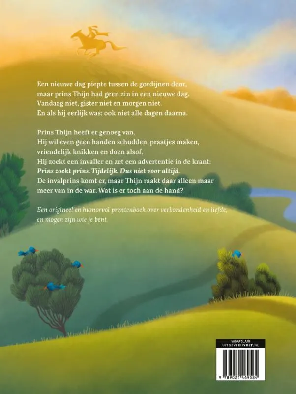 Prins Thijn heeft er genoeg van. Hij wil even geen handen schudden, praatjes maken, vriendelijk knikken en doen alsof. Hij zoekt een invaller en zet een advertentie in de krant: Prins zoekt prins. Tijdelijk. Dus niet voor altijd.