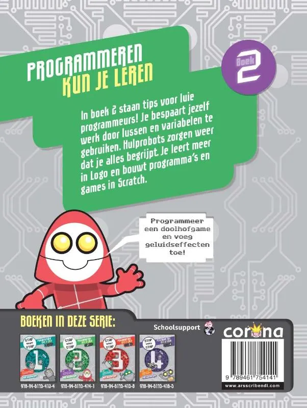 In boek 2 staan tips voor luie programmeurs! Je bespaart jezelf werk door lussen en variabelen te gebruiken. Hulprobots zorgen weer dat je alles begrijpt. Je leert meer in Logo en bouwt programma’s en games in Scratch.