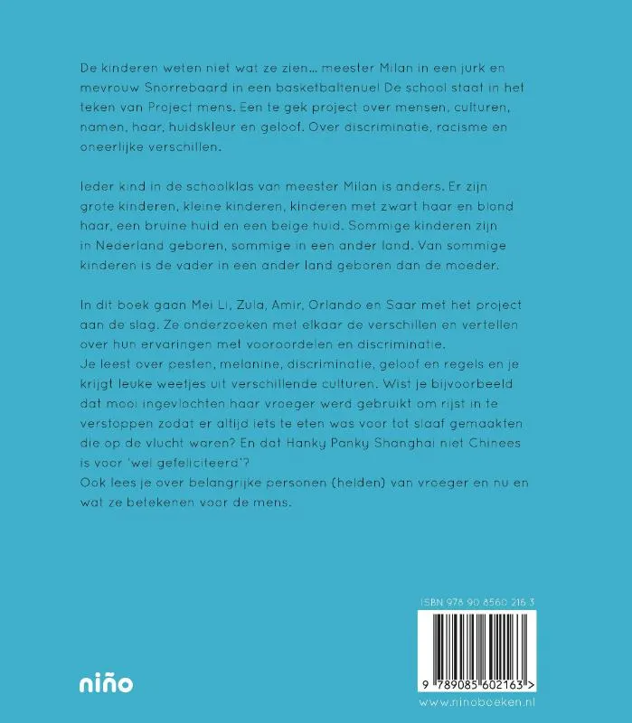 In dit boek gaan Mei Li, Zula, Amir, Orlando en Saar met het project aan de slag. Ze onderzoeken met elkaar de verschillen en vertellen over hun ervaringen met vooroordelen en discriminatie.