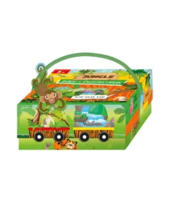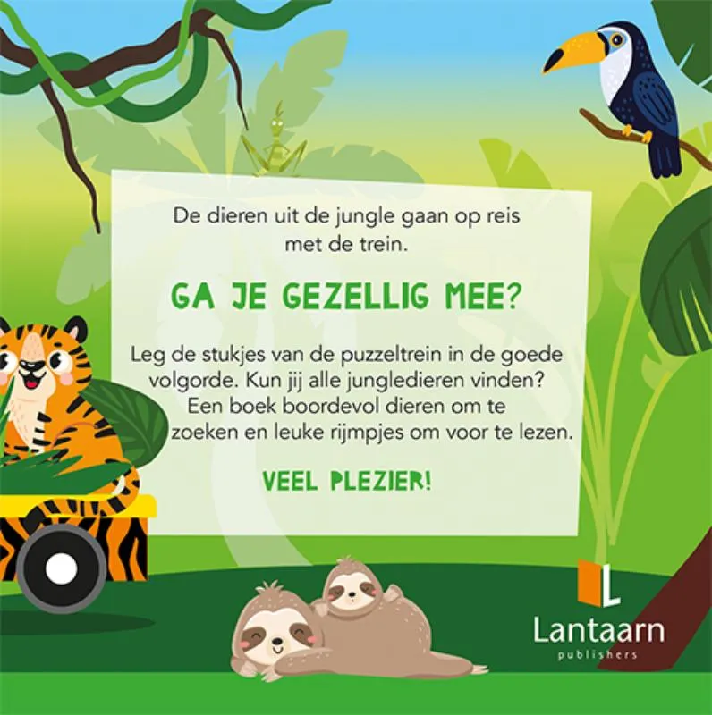 De dieren van de jungle gaan op reis met de trein! Ga je met ze mee? Leg de stukjes van de puzzeltrein in de goede volgorde en neem iedereen mee op reis. Een puzzel boordevol kleurige plaatjes om samen mee te spelen. Dit leuke doosje bevat tien puzzelstukken en een tien pagina tellend boekje vol met leuke rijmpjes. Zowel doosje, boekje als puzzelstukjes zijn van stevig karton gemaakt en voorzien van kleurrijke illustraties. Heb jij al ontdekt dat alle thema’s in de serie treinpuzzels op elkaar aansluiten? Verzamel ze allemaal en maak een superlange trein.