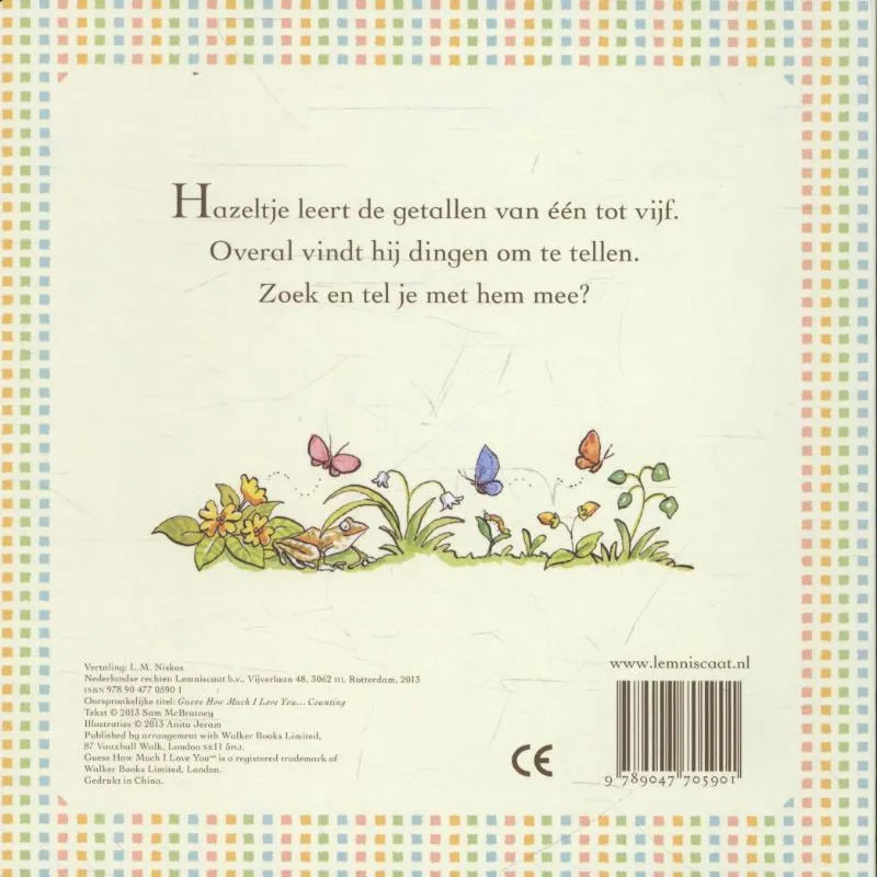 Nu verschijnt voor ieders allerjongste geliefden het vertederende kartonboekje Raad eens hoeveel ik van je hou… Tellen. Met je dreumes op schoot deze boekjes bekijken is een heerlijk moment van samenzijn, knuffelen, lezen en spelenderwijs leren.