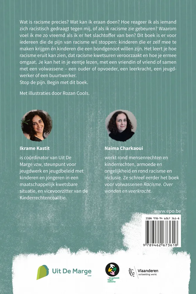 Wat is racisme precies? Wat kan ik eraan doen? Hoe reageer ik als iemand zich racistisch gedraagt tegen mij, of als ik racisme zie gebeuren? Waarom voel ik me zo vreemd als ik er het slachtoffer van ben? Dit boek is er voor iedereen die de pijn van racisme wil stoppen: kinderen die er zelf mee te maken krijgen én kinderen die een bondgenoot willen zijn. Het leert je hoe racisme eruit kan zien, dat racisme kwetsuren veroorzaakt, en hoe je ermee omgaat. Je kan het in je eentje lezen, met een vriendin of vriend of samen met een volwassene – een ouder of opvoeder, een leerkracht, een jeugdwerker of een buurtwerker. Stop de pijn. Begin met dit boek.