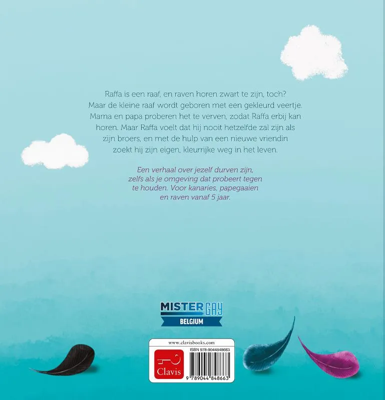 Raffa is een raaf, en raven horen zwart te zijn, toch? Maar de kleine raaf wordt geboren met een gekleurd veertje. Mama en papa proberen het te verven, zodat Raffa erbij kan horen. Maar Raffa voelt dat hij nooit hetzelfde zal zijn als zijn broers, en met de hulp van een nieuwe vriendin zoekt hij zijn eigen, kleurrijke weg in het leven.