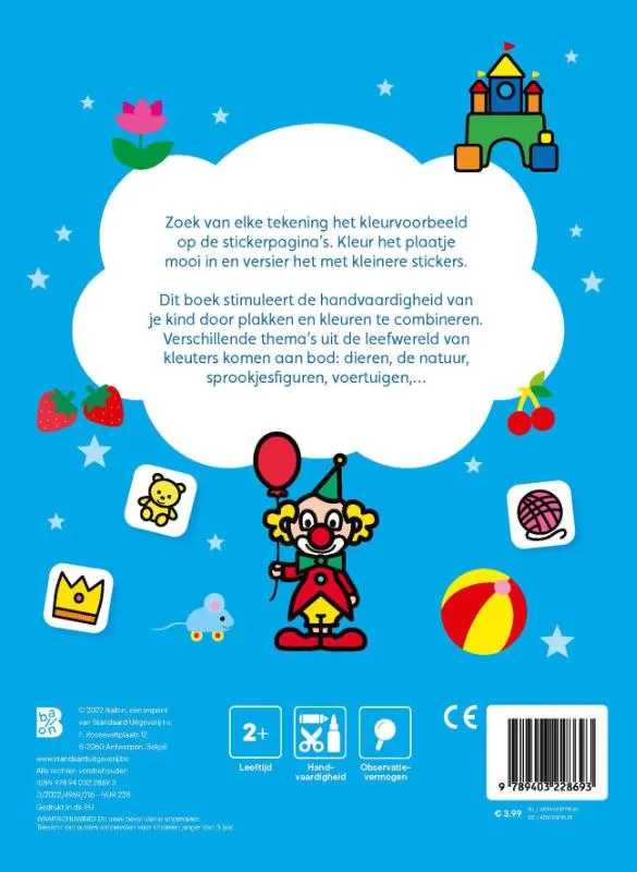 Dit boek stimuleert de handvaardigheid van kinderen vanaf 2 jaar door plakken en kleuren te combineren. Verschillende thema’s uit de leefwereld van kleuters komen aan bod: dieren, de natuur, sprookjesfiguren, voertuigen,…