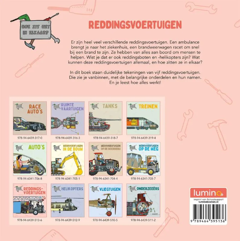 In dit boek staan duidelijke tekeningen van vijf reddingsvoertuigen. Die zie je vanbinnen, met de belangrijke onderdelen en hun namen. En je leest hoe alles werkt!