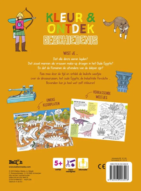 Reis mee door de tijd en ontdek de leukste weetjes over de dinosaurussen, het oude Egypte, de Industriële Revolutie … Bovendien kun je heel wat zelf inkleuren!