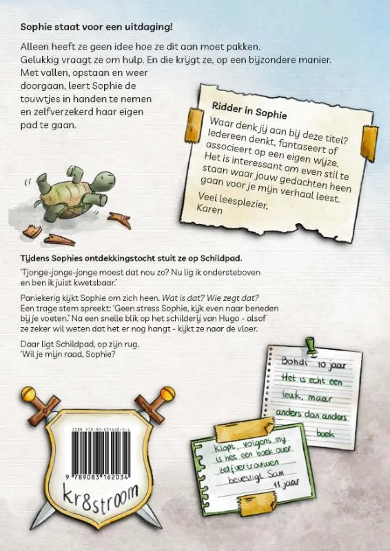 Sophie droomt over een kasteel waar verschillende dieren haar tips geven over hoe ze meer zelfvertrouwen kan krijgen. Informatief prentenboek met gekleurde illustraties. Vanaf ca. 9 jaar.