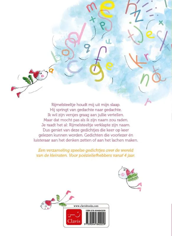 Rijmelsteeltje houdt mij uit mijn slaap. Hij springt van gedachte naar gedachte. Ik wil zijn versjes graag aan jullie vertellen. Maar dat mocht pas als ik zijn naam zou raden. Je raadt het al: Rijmelsteeltje verklapte zijn naam. Dus geniet van deze gedichtjes die keer op keer gelezen kunnen worden. Gedichten die voorlezer én luisteraar aan het denken zetten of aan het lachen maken.