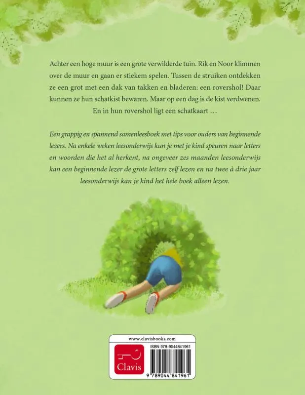 Achter een hoge muur is een grote verwilderde tuin. Rik en Noor klimmen over de muur en gaan er stiekem spelen. Tussen de struiken ontdekken ze een grot met een dak van takken en bladeren: een rovershol! Daar kunnen ze hun schatkist bewaren. Maar op een dag is de kist verdwenen. En in hun rovershol ligt een schatkaart …