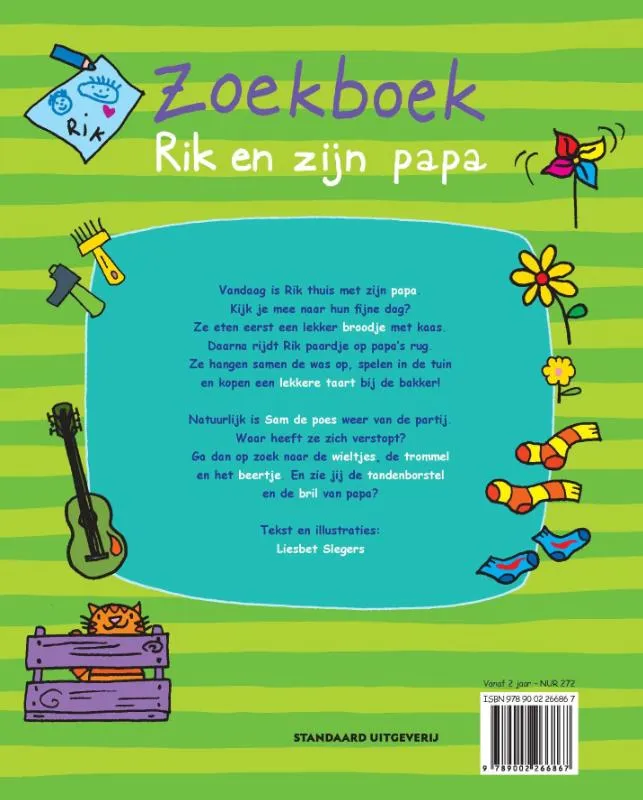 Vandaag is Rik thuis met zijn papa. Kijk je mee naar hun fijne dag? Ze eten eerst een lekker broodje met kaas. Daarna rijdt Rik paardje op papa’s rug. Ze hangen samen de was op, spelen in de tuin en kopen een lekkere taart bij de bakker!