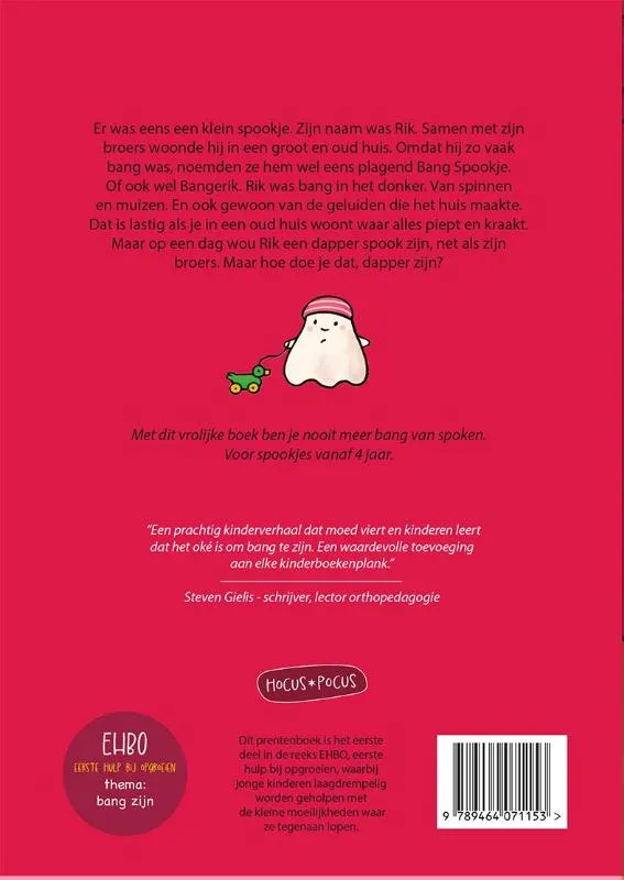 Er was eens een klein spookje. Zijn naam was Rik. Samen met zijn broers woonde hij in een groot en oud huis. Omdat hij zo vaak bang was, noemden ze hem wel eens plagend Bang Spookje. Of ook wel Bangerik. Rik was bang in het donker. Van spinnen en muizen. En ook gewoon van de geluiden die het huis maakte. Dat is lastig als je in een oud huis woont waar alles piept en kraakt. Maar op een dag wou Rik een dapper spook zijn, net als zijn broers. Maar hoe doe je dat, dapper zijn? Scan de QR-code op de achterflap van het boek en luister naar het verhaal, voorgelezen door de auteur.