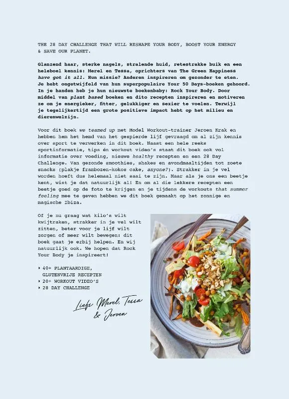 Glanzend haar, sterke nagels, stralende huid, retestrakke buik en een heleboel kennis: Merel en Tessa, oprichters van The Green Happiness have got it all. Hun missie? Anderen inspireren om gezonder te eten. Je hebt ongetwijfeld van hun superpopulaire Your 50 Days-boeken gehoord. In je handen heb je hun nieuwste boekenbaby: Rock Your Body. Door middel van hun plant based boeken en dito recepten inspireren en motiveren ze om je energieker, fitter, gelukkiger en sexier te voelen. Terwijl je tegelijkertijd een grote positieve impact hebt op dierenwelzijn en het milieu.