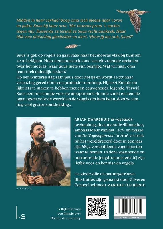 Arjan Dwarshuis, enthousiaste vogelaar en bekend van De Vogelspotcast, schreef een spannende jeugdroman over een jong meisje en een roerdomp. Met schitterende fullcolourillustraties van Zilveren Penseel-winnaar Marieke ten Berge.<br> Suus is gek op vogels en gaat vaak naar het moeras vlak bij huis om ze te bekijken. Op een dag raakt ze tot haar grote verbazing bevriend met een pratende roerdomp. Daardoor moet ze denken aan de verhalen van haar dementerende oma, die vaak stemmen in het moeras hoorde. Suus stuit op een eeuwenoude legende die iets met de eenzame Ronnie te maken lijkt te hebben. Intussen probeert ze de mopperende roerdomp aan een roerdompe te helpen en hem de ogen te openen voor de wereld en de vogels om hem heen.<br> Arjan Dwarshuis is beroepsvogelaar, bekende podcaster, columnist en ambassadeur van het IUCN. Zijn podcastserie De Vogelspotcast is razend populair en nu wil Arjan zijn liefde voor vogels met kinderen delen. Dit is het eerste deel over Suus en Ronnie de roerdomp.<br> De Vogelspotcast werkt enorm aanstekelijk.<br> *****de Volkskrant<br>