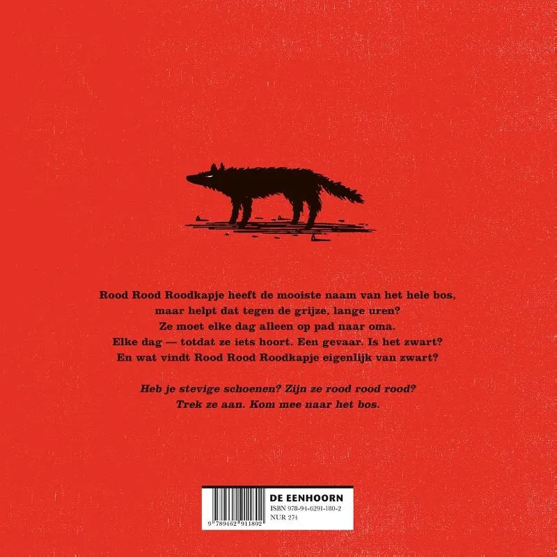 Er was eens een meisje dat gek was op rood. Haar speelgoed, kleren, eten waren rood. Jammer genoeg waren haar dagen grijs. Elke dag moest ze door het grijze bos om haar grijze oma te bezoeken. Maar op een dag ontmoette ze in het bos iets nieuws, iets … zwarts.