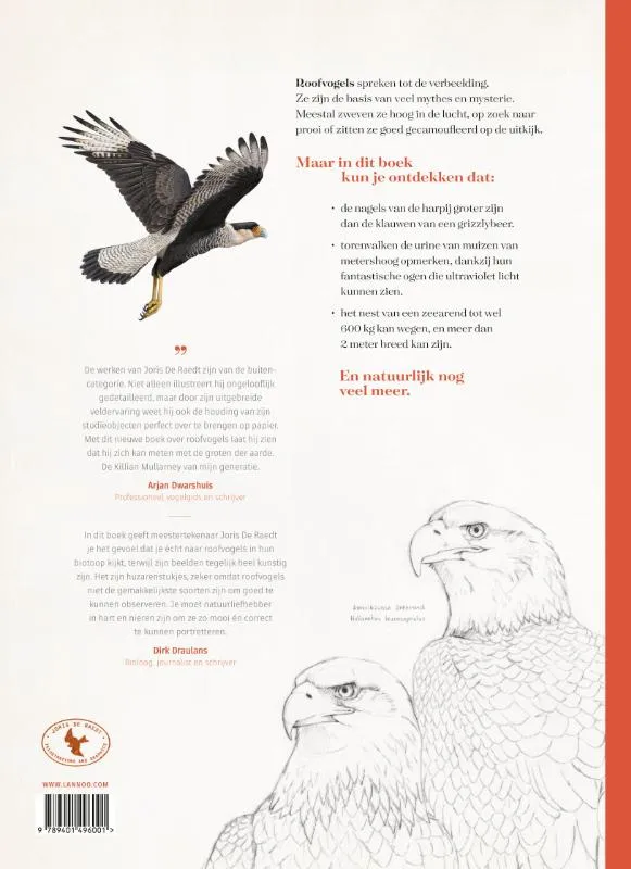 ‘In dit boek geeft meestertekenaar Joris De Raedt je het gevoel dat je écht naar roofvogels in hun biotoop kijkt, terwijl zijn beelden tegelijk heel kunstig zijn. Het zijn huzarenstukjes, zeker omdat roofvogels niet de gemakkelijkste soorten zijn om goed te kunnen observeren. Je moet natuurliefhebber in hart en nieren zijn om ze zo mooi én correct te kunnen portretteren.’