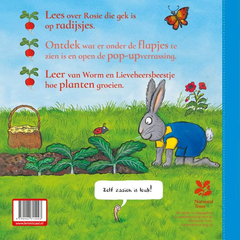 Rosie is dol op radijsjes, dus als haar vrienden Worm en Lieveheersbeestje voorstellen dat ze haar eigen radijsjes kweekt, gaat ze al snel aan de slag. Volg Rosie terwijl ze haar radijsjes ziet groeien en til de flapjes op om te zien wat er onder de grond gebeurt. Aan het eind vind je een bijzondere pop-up-verrassing.