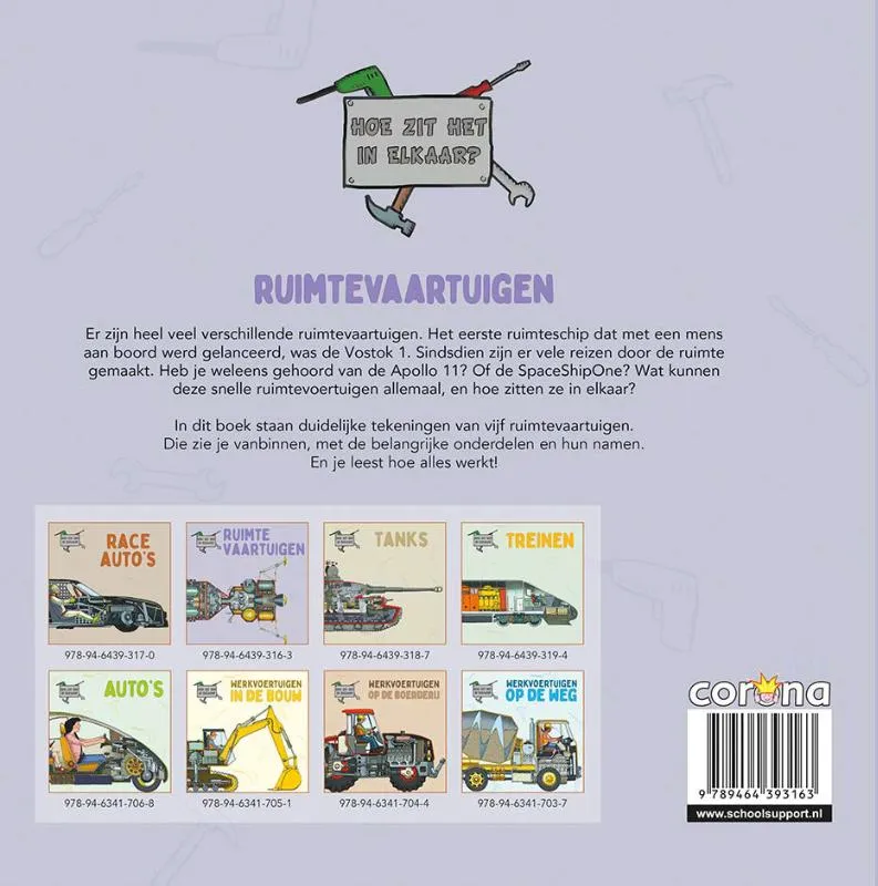 In dit boek staan duidelijke tekeningen van vijf ruimtevaartuigen. Die zie je vanbinnen, met de belangrijke onderdelen en hun namen. En je leest hoe alles werkt!