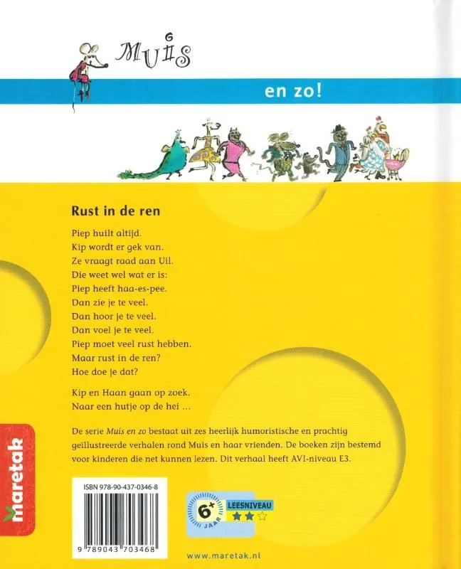 Piep huilt altijd. Kip wordt er gek van. Tot Uil begrijpt wat er is: Piep heeft haa-es-pee. Dan zie je te veel, hoor je te veel en voel je te veel. Piep moet rust hebben! Maar rust in de ren? Hoe doe je dat? En dus gaan Kip en Haan op zoek naar een hutje op de hei …