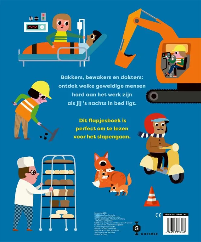 Het lijkt soms misschien alsof iedereen ’s nachts lekker in zijn warme bedje ligt, maar dat is niet het geval! In dit kleurrijke boek staan een paar beroepen die diep in de nacht uitgevoerd worden, zodat het leven elke ochtend weer in alle drukte kan beginnen. Denk aan beroepen als visser en machinist, en ook de dokter en verpleger zijn al heel vroeg aan het werk. Zoals zo vaak opent Ingela P Arrhenius de ogen van de allerkleinsten voor nieuwe, spannende concepten met meer informatie over de wereld om hen heen.