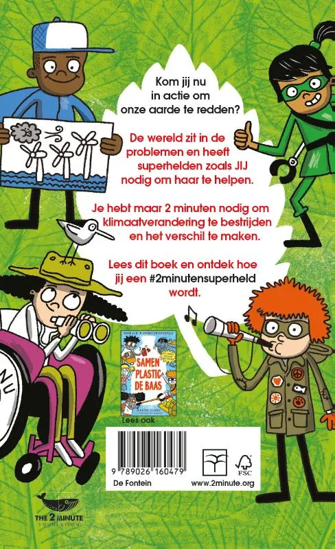 Het klimaat op aarde verandert razendsnel. We moeten onze planeet redden en jij kunt daaraan bijdragen. In Samen klimaatverandering de baas lees je hoe je een #2minutensuperheld kunt worden: voltooi de missies thuis en op school en bescherm onze aarde.