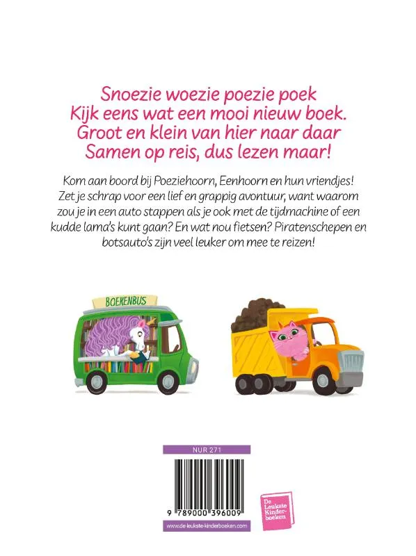 Stap aan boord bij Poeziehoorn, Eenhoorn en hun vriendjes! Zet je schrap voor een lief en grappig avontuur, want waarom zou je in een auto stappen als je ook met de tijdmachine of een horde lama’s kunt gaan? En wat nou fietsen? Piratenschepen en botsauto’s zijn veel leuker om mee te reizen!